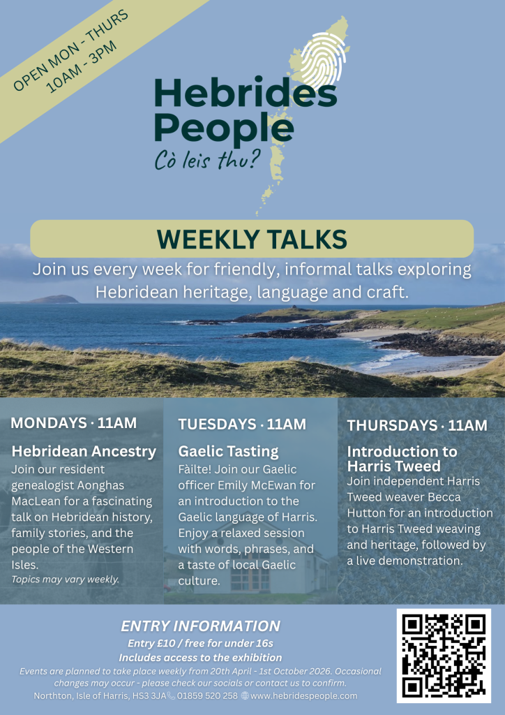 We also host weekly talks on Hebridean ancestry, Gaelic language and Harris Tweed weaving, running from April to October.